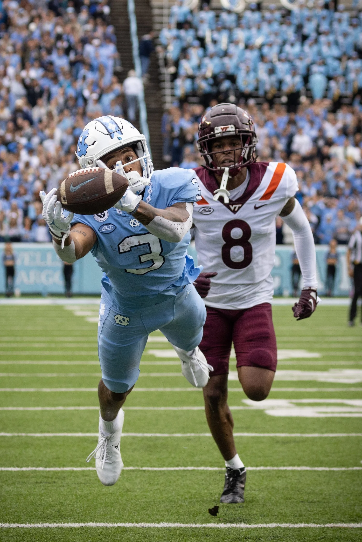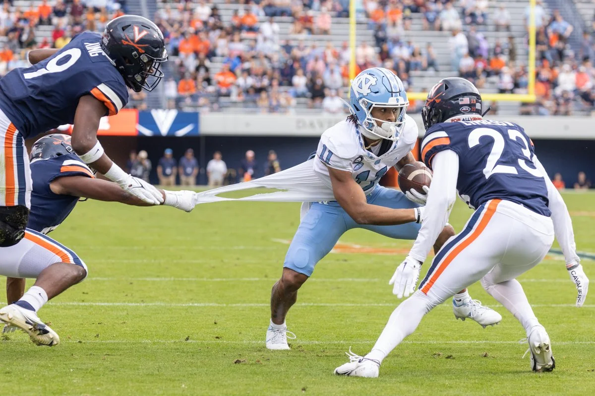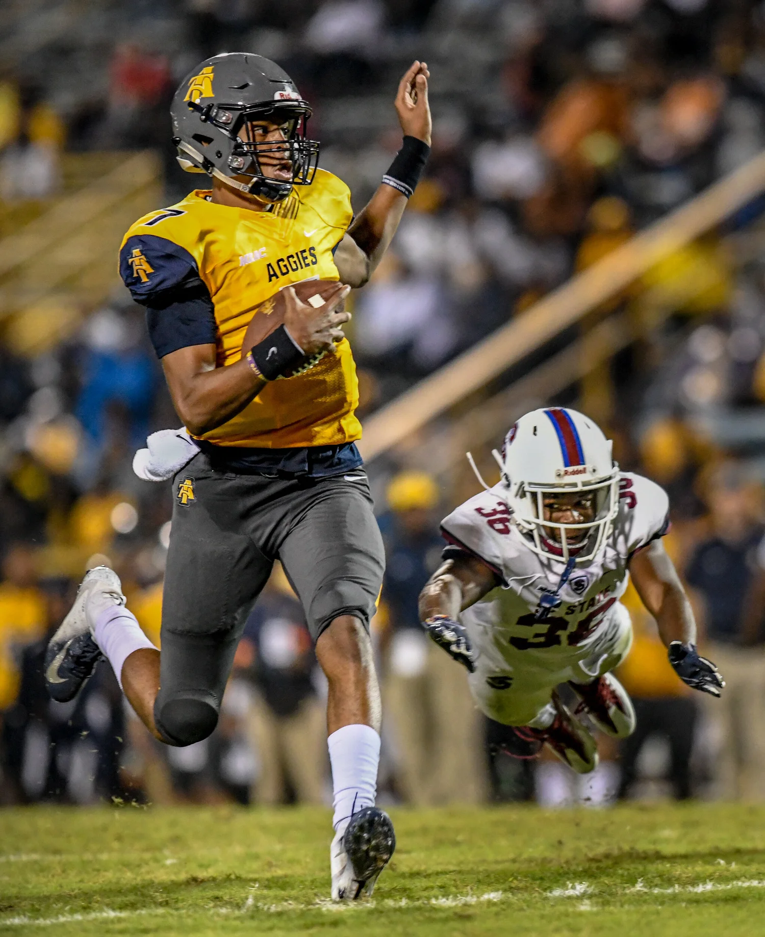 North Carolina A&T's Lamar Raynard (left) escapes from South Carolina State's Scott Robinson on Thursday, September 27, 2018 at BB&T Stadium in Greensboro, N.C.