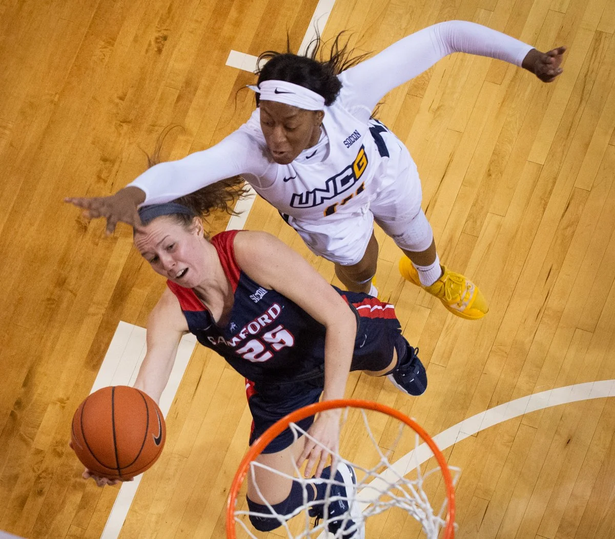 Furman's Ben Hale (right) punches the ball over University of North Carolina Greensboro's Josh Masten on Saturday, October 27, 2018 in Greensboro, N.C.